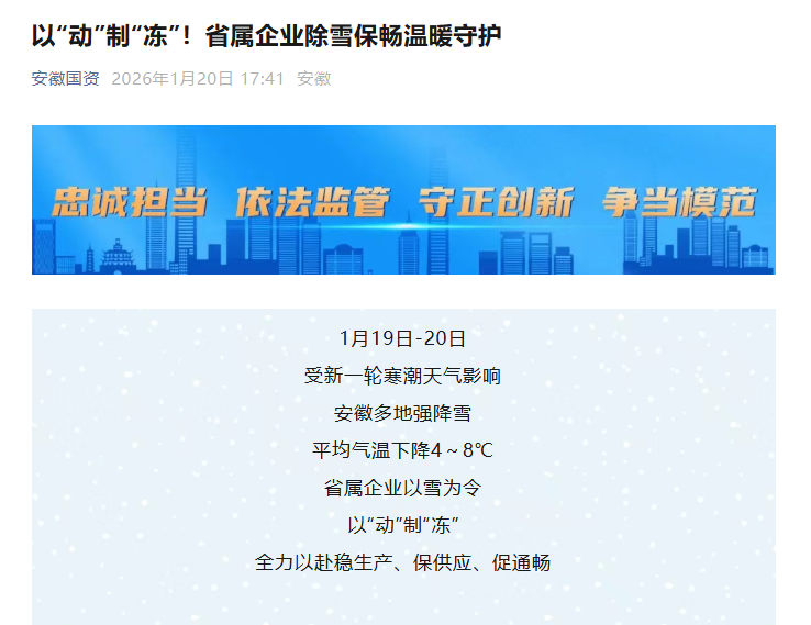 1月20日安徽國(guó)資微信公眾號(hào):以“動(dòng)”制“凍”!省屬企業(yè)除雪保暢溫暖守護(hù)